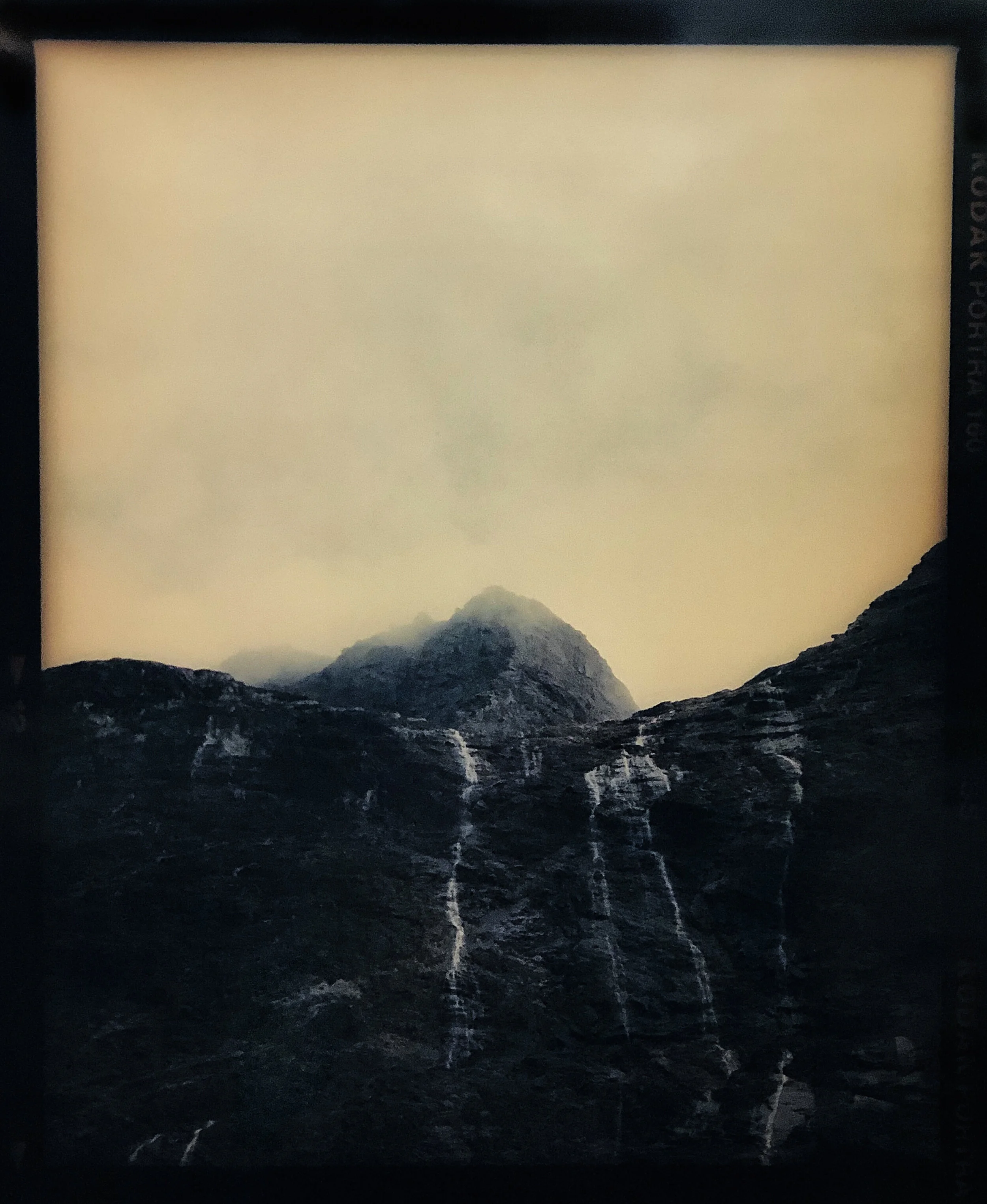 Presented as imposing poster-sized chromogenic prints, attached directly to the wall without an intermediary barrier of glass or frame to soften their impact, the works in this exhibition are viscerally effective. In Gulliver Peak, Southland, New Zealand, Henderson presents the mountain’s top emerging from behind a rampart of black cliffs, a stark and alien scene that is almost abstracted in its division of the picture plane into horizontal bands of darkness and light. The mountain peak itself, fading at its edges into the surrounding clouds, functions as a kind of liminal, intermediary zone, collapsing the oppositional pairing of stone and sky. Elsewhere, in Lady Bowen Falls, Milford Sound, New Zealand, the titular waterfall takes on a ghostly cast, seeming to emerge from the pool and the surrounding rocks with an eerie agency rather than pouring blindly from above. In this respect, its closest historical parallels might be James Valentine’s images of Rotorua geyser plumes, which seem to hang in the air like the ectoplasmic beings of Victorian spirit photography.