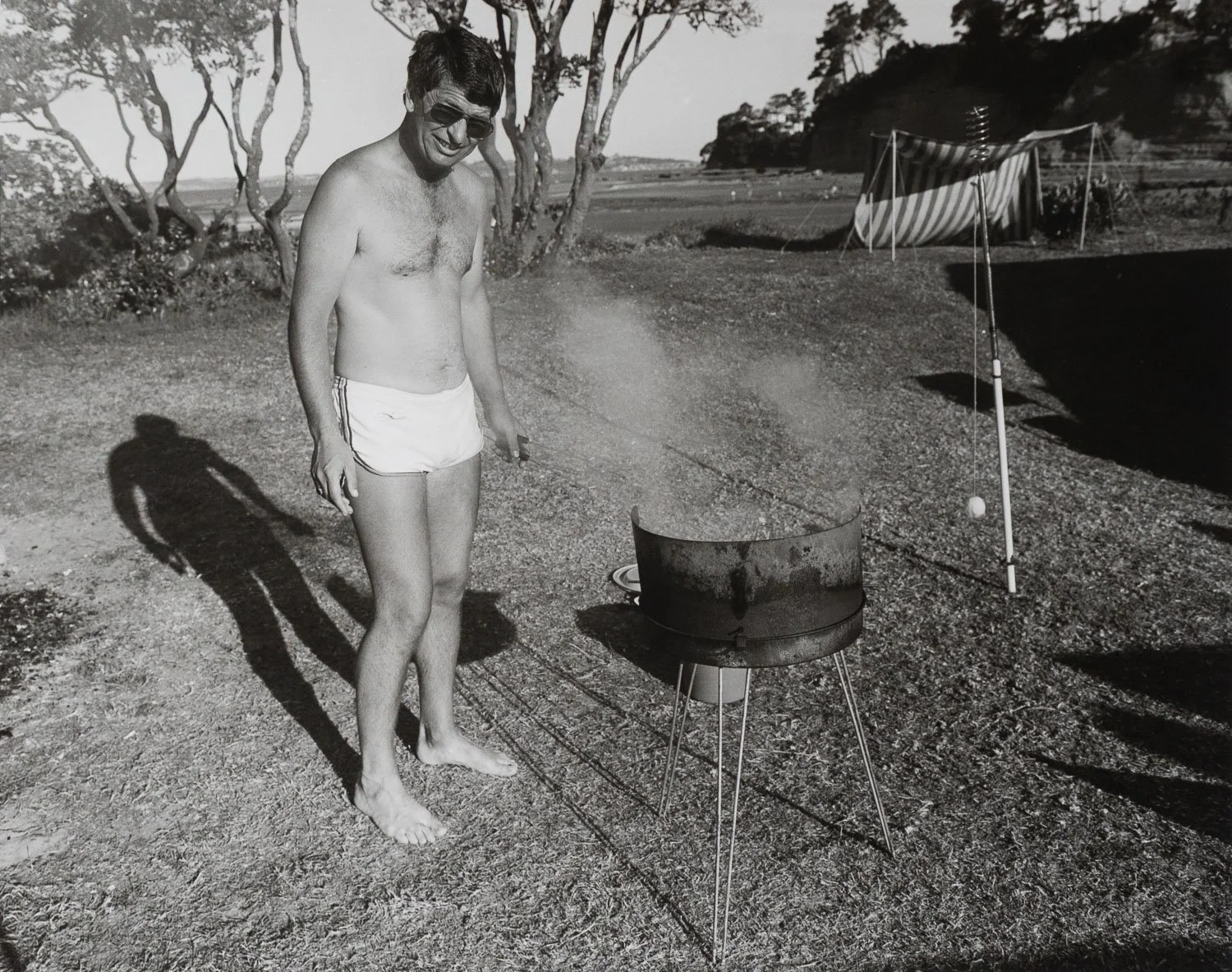 Clive Stone, Man with barbeque and shadow, 1984. Vintage silver gelatin print, signed on verso. Image size 240 x 190mm. Exhibited at Real Pictures Gallery, Auckland, 1988. Held in Auckland Art Gallery collection. Published in PhotoForum online essay “Clive Stone’s Hibiscus Coast revisited” by Nina Seja, 2019