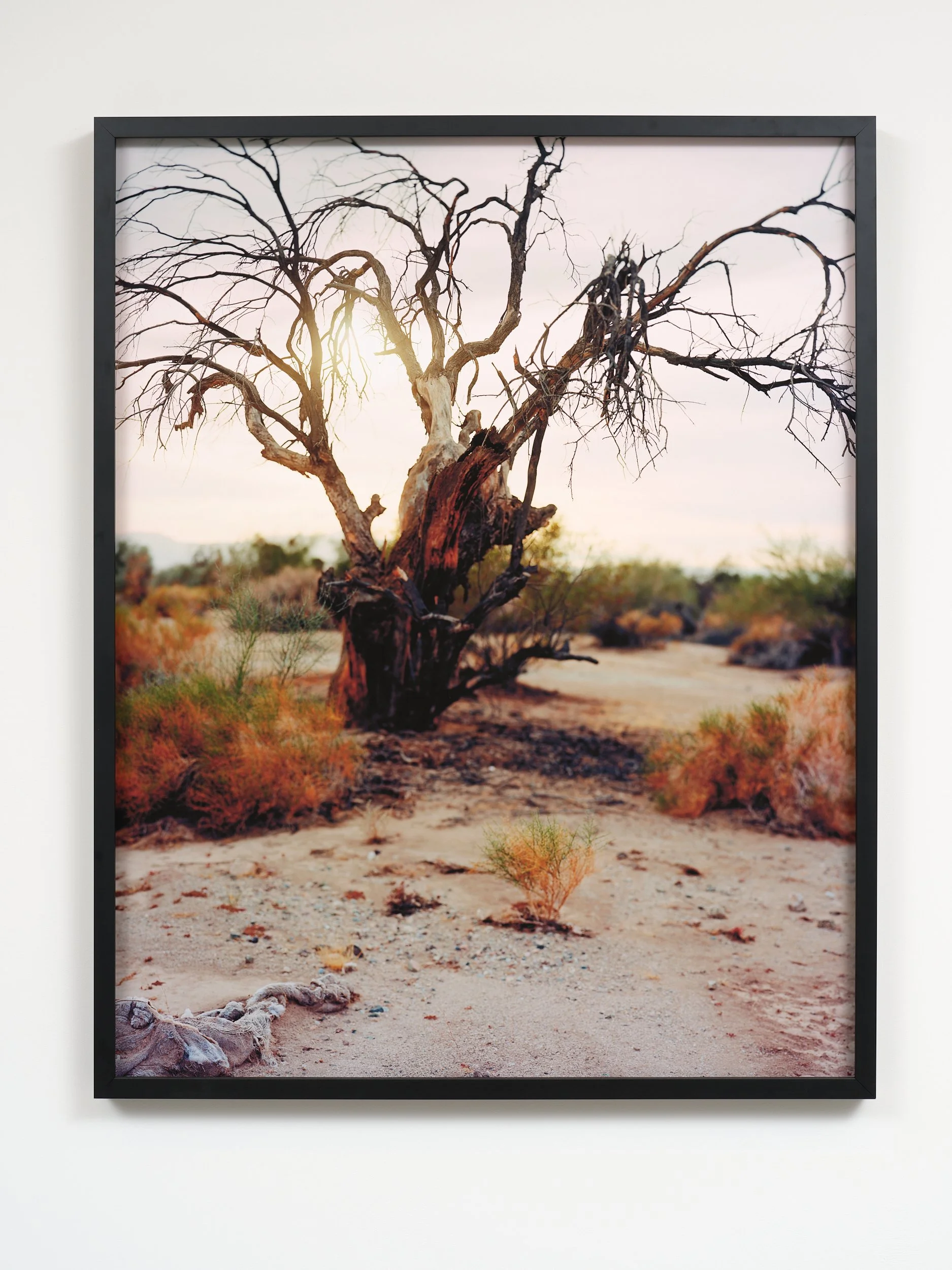 Campbell arrived at the site, which is administered by the United States Bureau of Land Management, after one such flood and has described the space as utterly marginal – a land occupied by itinerant recreational vehicle owners, boy racers in all-terrain-vehicles, and gun enthusiasts seeking an open range.3 She returned three days in a row to capture the hopeful, pink light of dawn, and instead of using a horizontal format to emphasise the expansive desert horizon, she chose a vertical format and a narrow depth of field to emphasise the sculptural shapes of the trees and the human traces. Here a mangled piece of cloth that looks like a dessicated limb; there a dark hollow that likely gave shelter to a human who was down on their luck.