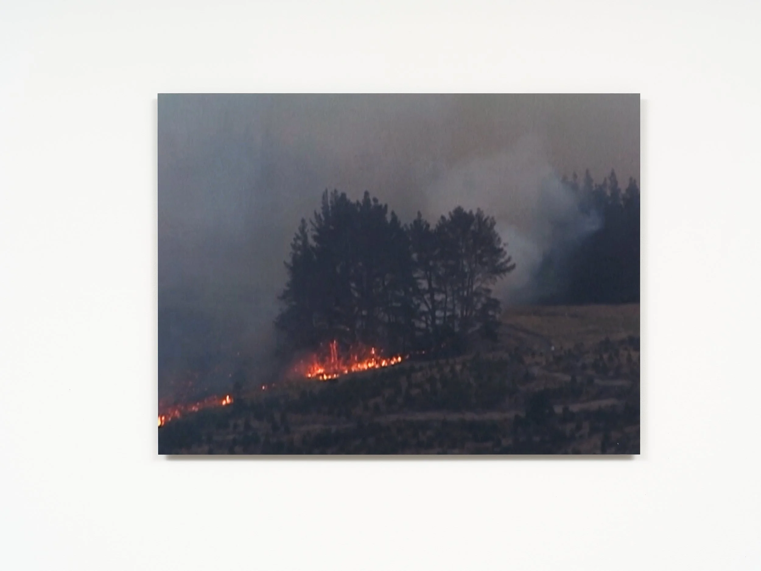 Sam Norton’s photographs of pine trees consumed by smoke and fire in Christchurch’s Port Hills are more like cinematic tableau than documentary images. Originally made as video footage on a Handycam during the 2017 fires, they’ve been printed as screenshots, which gives them a glitchy, blurred materiality. Rather than being concerned with a specific time and place, Norton took a poetic and open-ended approach to making this series, aiming to create a sense of unease and “a deliberate ambiguity between smoke and mist”.4 These photographs echo our growing awareness of the entanglement of ‘natural’ and anthropogenic forces that are shaping the baffling and often frightening weather we now experience in our daily lives.