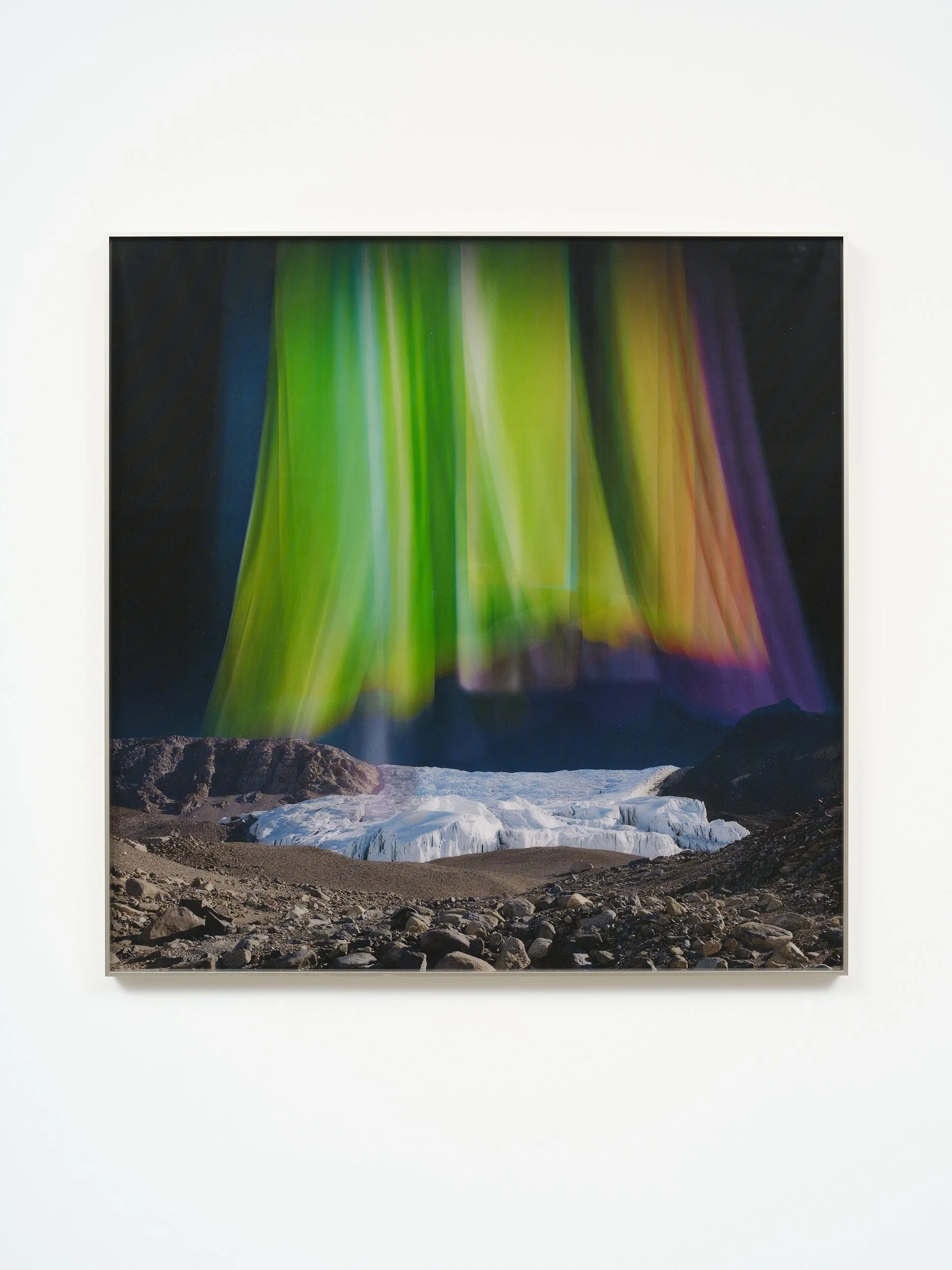 Megan Jenkinson’s spectacular lenticular photograph Atmospheric Optics 1 can also be read through a romantic lens, with its emphasis on imagination, subjectivity and human perceptions of nature. The work results from her Antarctic Artist’s Fellowship in 2005 when she became interested in the chimerical beauty of dancing columns of light, known as auroras, which are created by Antarctica’s freezing temperatures and low humidity. Jenkinson has imagined auroras as shimmering swathes of fabric suspended above the eerie landscape of Antarctica’s Dry Valleys. This work belongs to a series made using digital photography, Photoshop and prismatic plastic lenses to create a lenticular effect, causing the image to flicker and flare as you move past it. When I first encountered these photographs in 2007, I was struck by their cinematic quality and visual trickery; their celebration of the otherworldly nature of the continent and its atmospheric marvels. Now, with my growing awareness of rapid shrinkage occurring on the Antarctic Ice Sheet, and the implications of this for Earth’s climate, it’s hard not to feel a sense of loss saturating this photograph.
