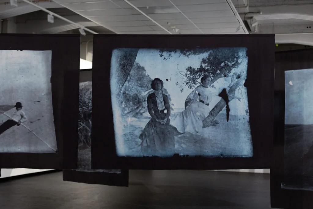 Inflected with the personal nature of Brennan’s connection to Laurent, the installation considers the ways we navigate the span of time and distance. Cracked, tarnished and peeling in places, the negatives are marked by the traces of time’s passage. In scanning and printing these images – and the detritus of their surface damage – onto large-scale silk banners, Brennan shifts the materiality of these archival fragments, translating them into a physically navigable space.