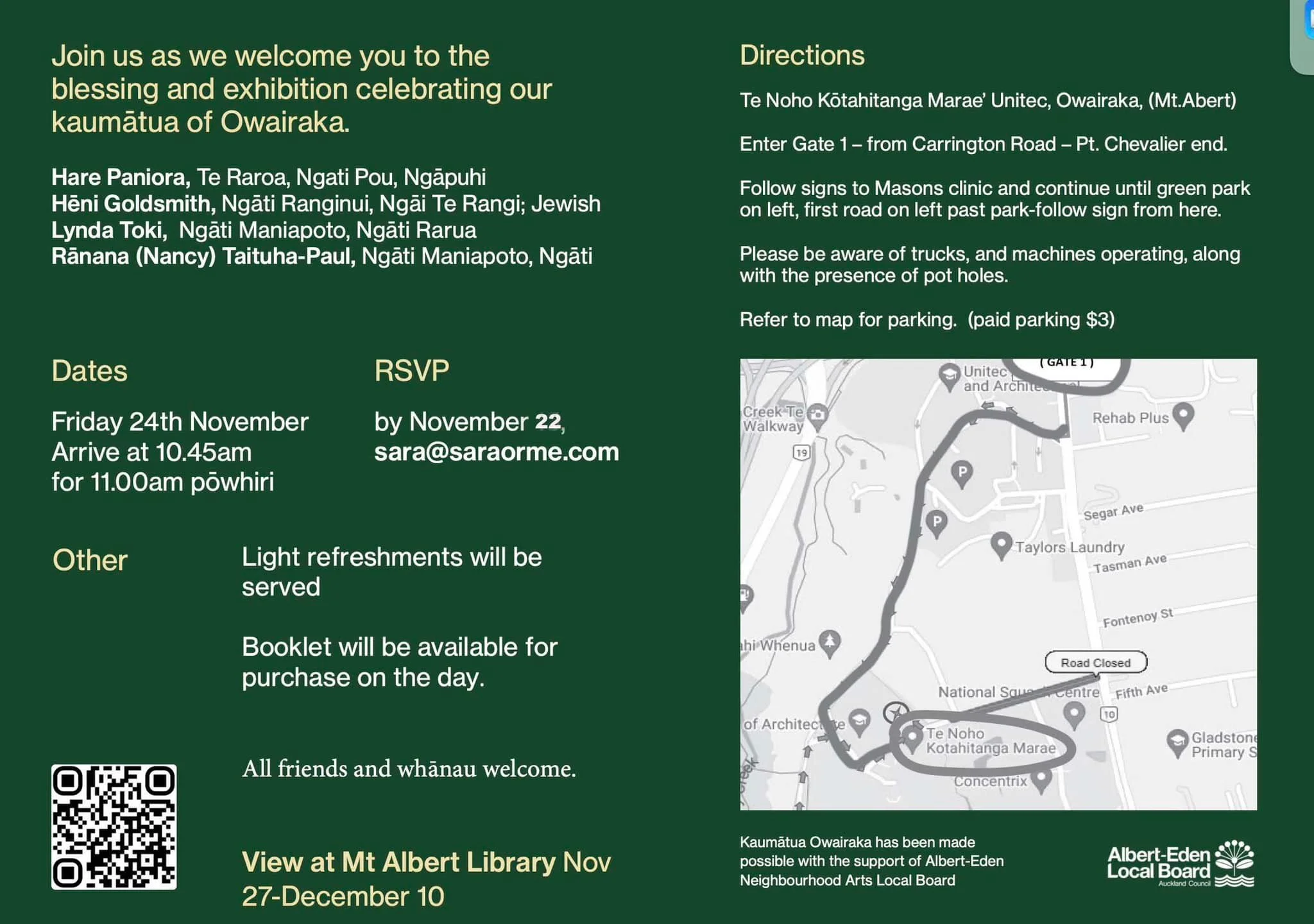 Community engagement is essential to this kaupapa and will be celebrated every step of the way. If you’re in Tamaki come join in as celebrate with our very first four kaumātua- from Owairaka - and bless the kaupapa for all of those to follow at Te Noho Kotahitanga Marae, Ōwairaka Mount Albert with kōrero, poetry, waitata…